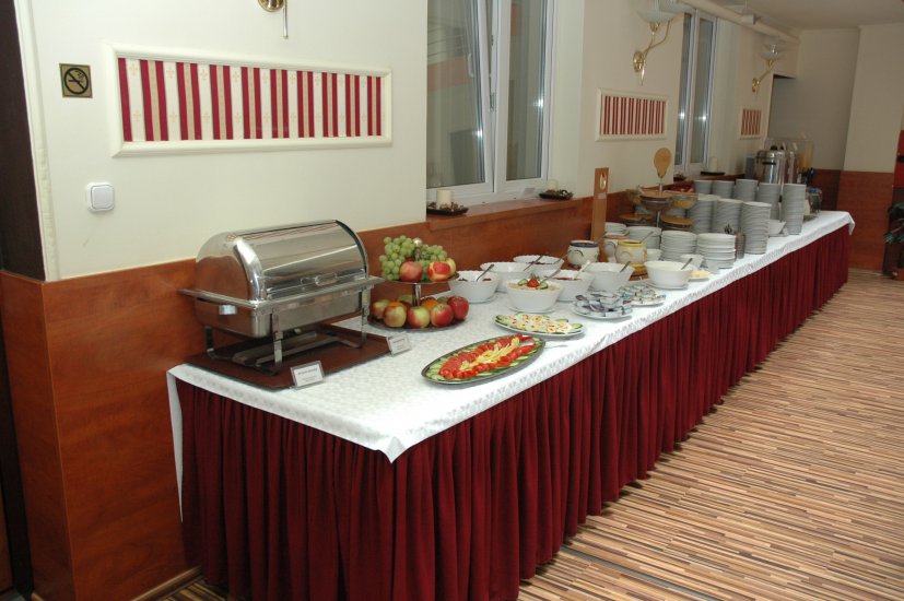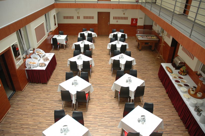 Az átriumban kapott helyet a reggeliző helység, ahol egyszerre száz vendég tudja kényelmesen elfogyasztani melegtálas svédasztalos reggelijét.