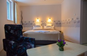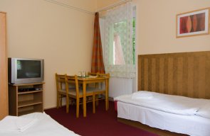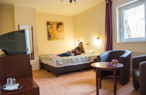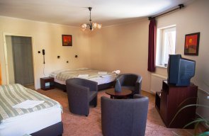 We host guests each day of the year in comfortable double and twin bed, triple and quadruple rooms with low prices and discounts. All of our rooms are equipped with super comfortable beds, bathroom and television. The relaxation of guests is provided by our wellness section with private usage, café with terrace, huge inner courtyard, free parking area and our warm hospitality.